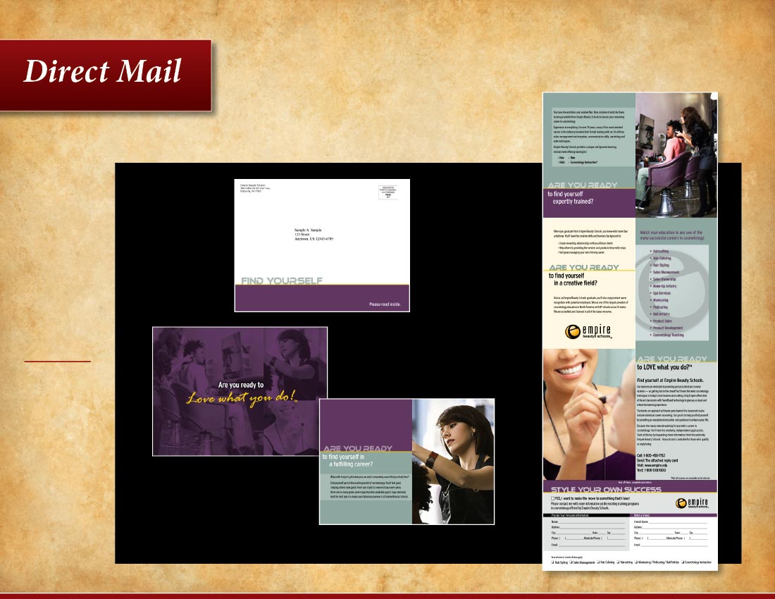 This engaging self-mailer targeted college-age females and promoted cosmetology as a rewarding career move. Empire Beauty