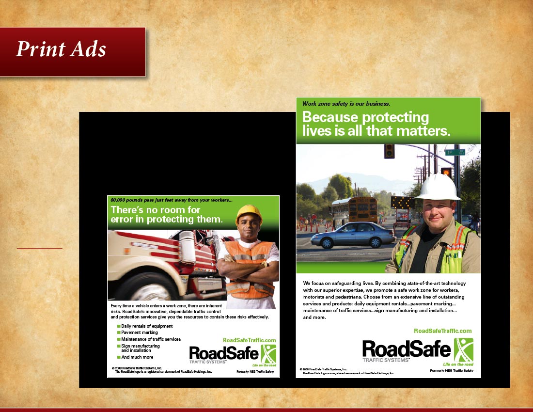 RoadSafe, a provider of traffic control products and equipment, wanted to promote their mission to protect work crews, motorists and pedestrians. These ads appeared in two major road construction trade publications to help increase awareness of the company and its services.