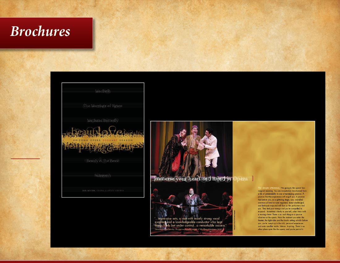 Created for the Arizona Opera, this brochure highlighted the new opera season and was intended to attract an audience that typically may not attend an opera. Copy for the different operas, including “Macbeth” and “The Marriage of Figaro” were written in an impactful and emotional manner yet not too “high-brow.”