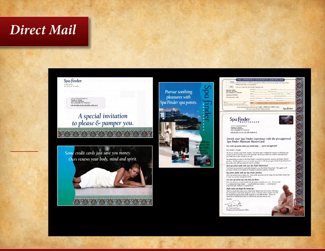 Introducing the SpaFinder MasterCard, this direct mail package combined the traditional credit card benefits of pre-approval and no annual fee with spa points specifically tailored to SpaFinder members. These spa points could be redeemed for vacations, spa activities and other healthy lifestyle products and services that are meaningful to SpaFinder members.