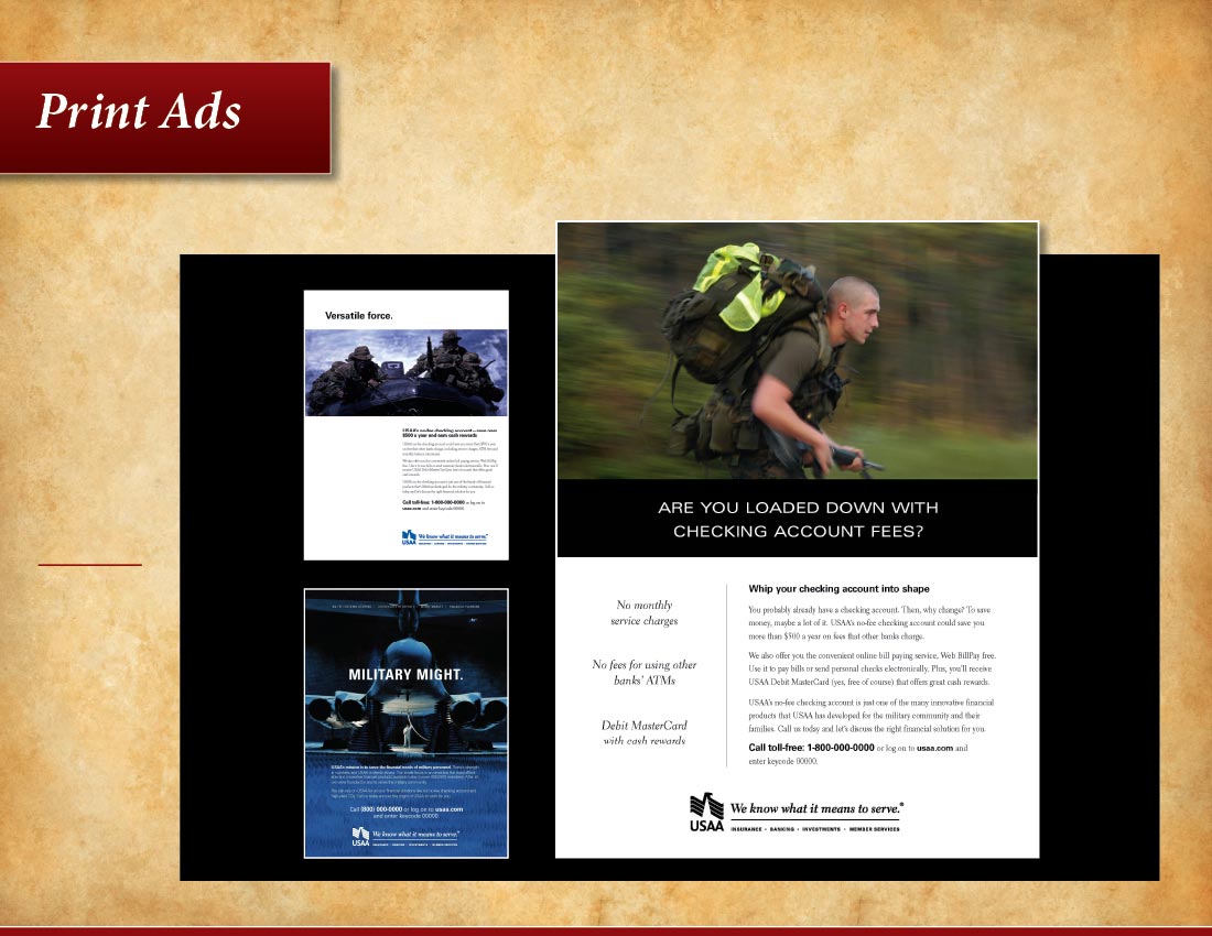 Series of brand and product ad concepts developed for USAA positioning the company as a preferred resource for financial and insurance services available to military personnel and their families.